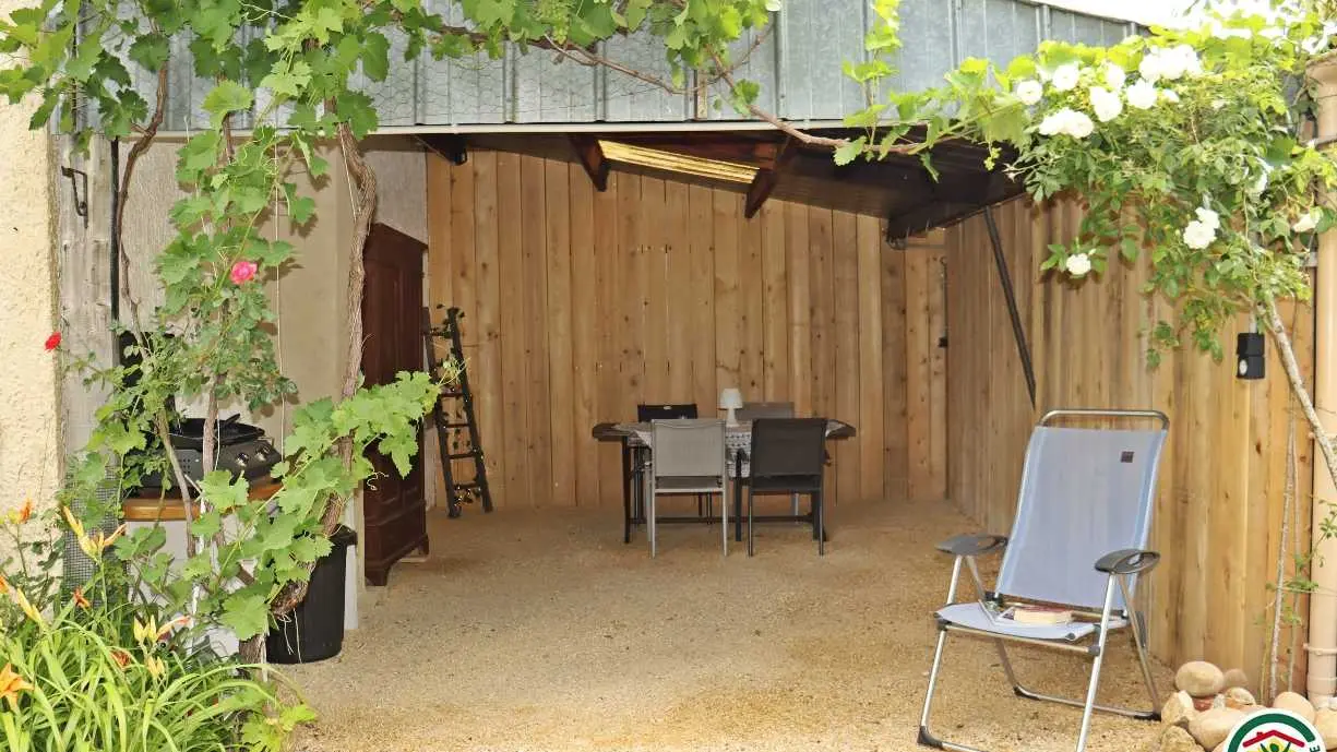 Maison indépendante fraîchement rénovée, sur deux niveaux. En rez-de-jardin, entrée par le séjour : espace repas et coin salon (canapé, TV), poêle à bois, cuisine équipée ouverte sur la pièce, salle d'eau/wc (cabine de douche, lavabo). A l'étage : deux chambres dotées chacune d'un lit double (1x140) (1x140). Salon de jardin, bains de soleil et barbecue à disposition, aucun vis-à-vis. Stationnement sur la propriété.