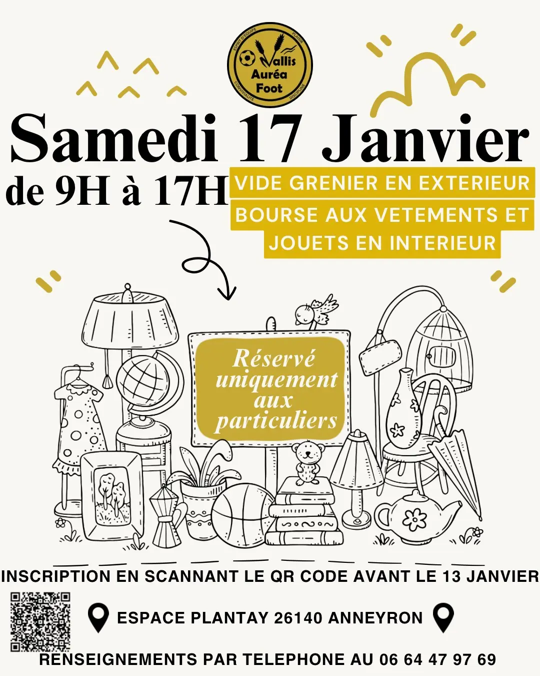 L'association Vallis Auréa Foot organise cet événement. La bourse aux vêtements se situera à l'intérieur , le vide grenier quant à lui sera à l'extérieur.