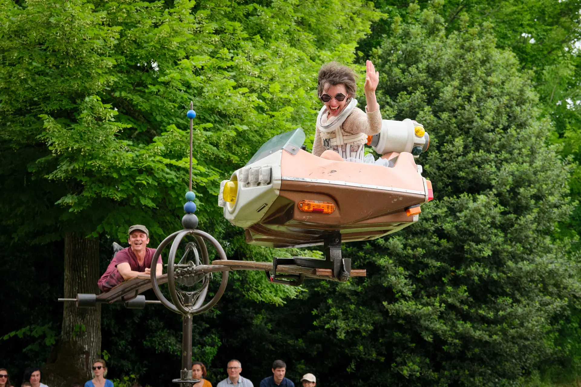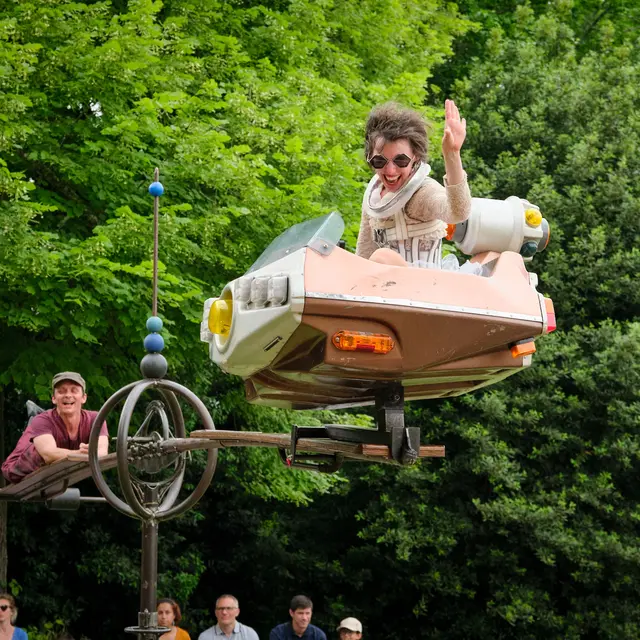 Deux clowns cosmiques s’apprêtent à décoller. Autour de leur astrolabe de fortune, ils chatouillent nos vieux rêves d’astronautes et d’apesanteur.